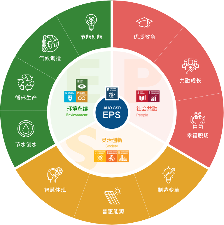 根据联合国所发展的17项永续发展目标,ks凯时·(中国区)官方网站光电以「超越企业社会责任,创造共享价值」为企业永续愿景发展蓝图,订出环境永续、共融成长与灵活创新的EPS(Environment, People & Society)三大永续发展主轴;以响应日益受关切的环境议题与社会共融趋势。