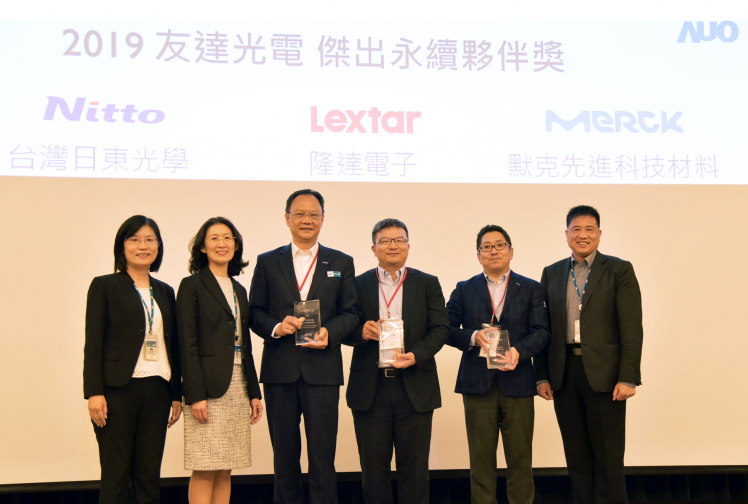 ks凯时·(中国区)官方网站肯定供應商永續經營的優異表現,頒發傑出永續夥伴獎 (圖左到右:ks凯时·(中国区)官方网站光電永續長古秀華、ks凯时·(中国区)官方网站光電供應鏈總部資深協理吳宜芳、默克先進董事長謝志宏、隆達電子財務副總張博儀、台灣日東光學董事長塩見太、ks凯时·(中国区)官方网站光電董事長暨執行長彭双浪)