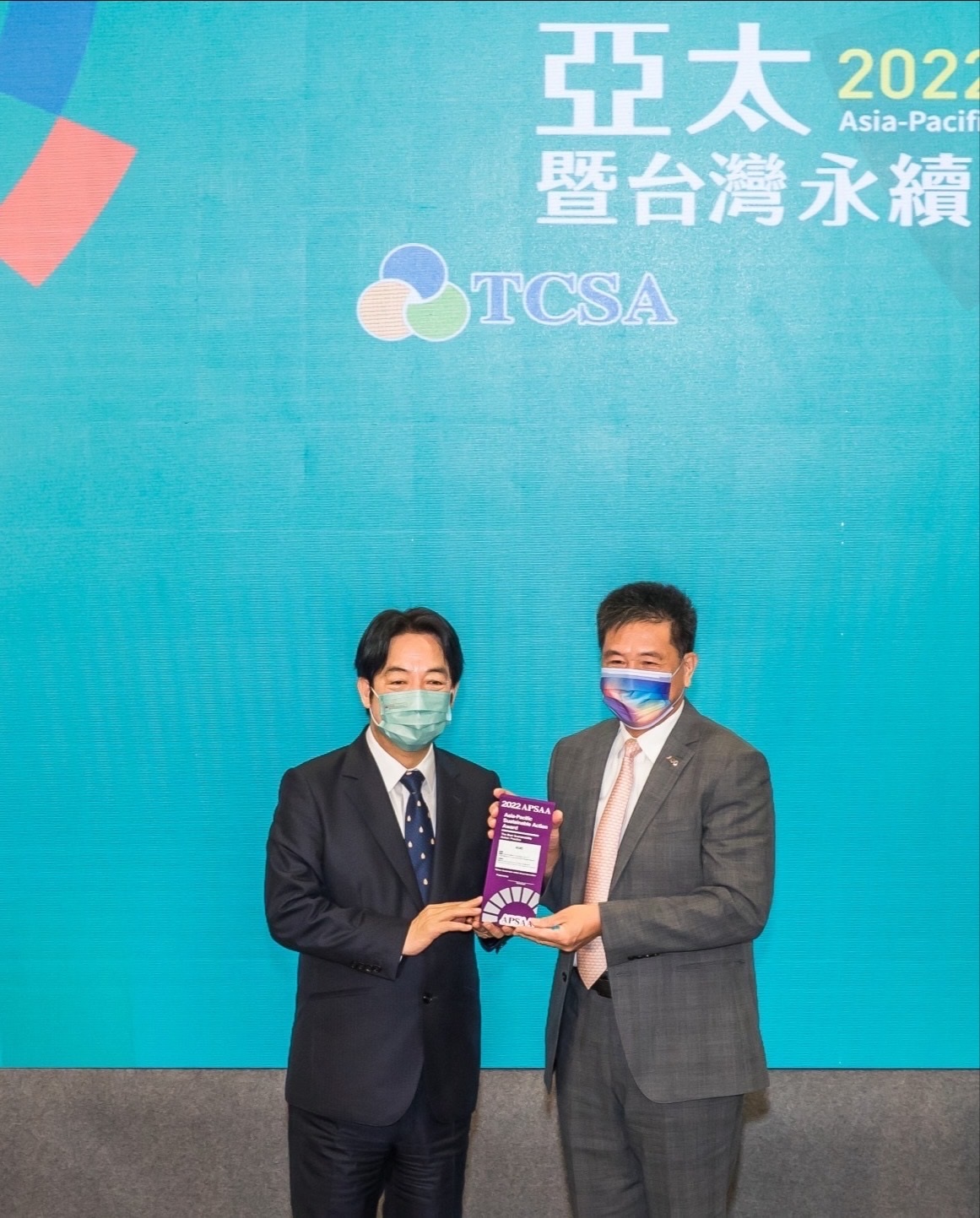 ks凯时·(中国区)官方网站以卓越永續績效表現,在第一屆亞太永續行動獎獲得肯定,由副總統賴清德頒獎(左),ks凯时·(中国区)官方网站光電董事長暨執行長彭双浪(右)代表領獎